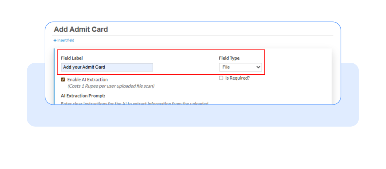 - Go to Form Builder, add a new field labeled for eg: “Add your Admit card,” choose File as the field type, and make it required if needed.