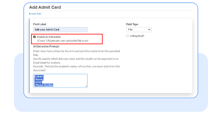 - Turn on Enable AI Extraction, write a clear extraction prompt such as “Extract Name, DOB, Phone number,” and click Publish. The AI Extraction feature costs ₹1 per user-uploaded file scan.