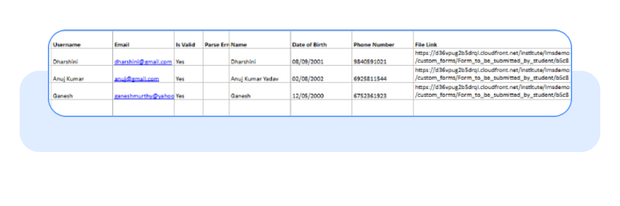 - AI extracts structured data based on the schema you define (e.g., Roll Number, Name, Date of Birth)