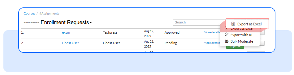 You can now bulk approve or bulk disapprove enrollment requests in one action, instead of reviewing them one by one. With AI-powered signals highlighting problematic submissions, admins can process large volumes faster, stay accurate, and keep a clean audit trail.