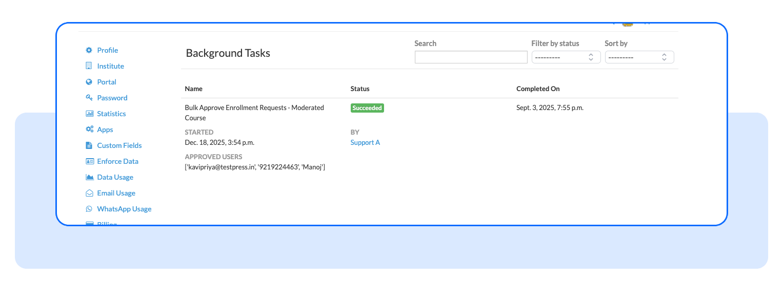 The bulk action runs in the background. Admins can track progress and view success and failure reports directly from the dashboard.