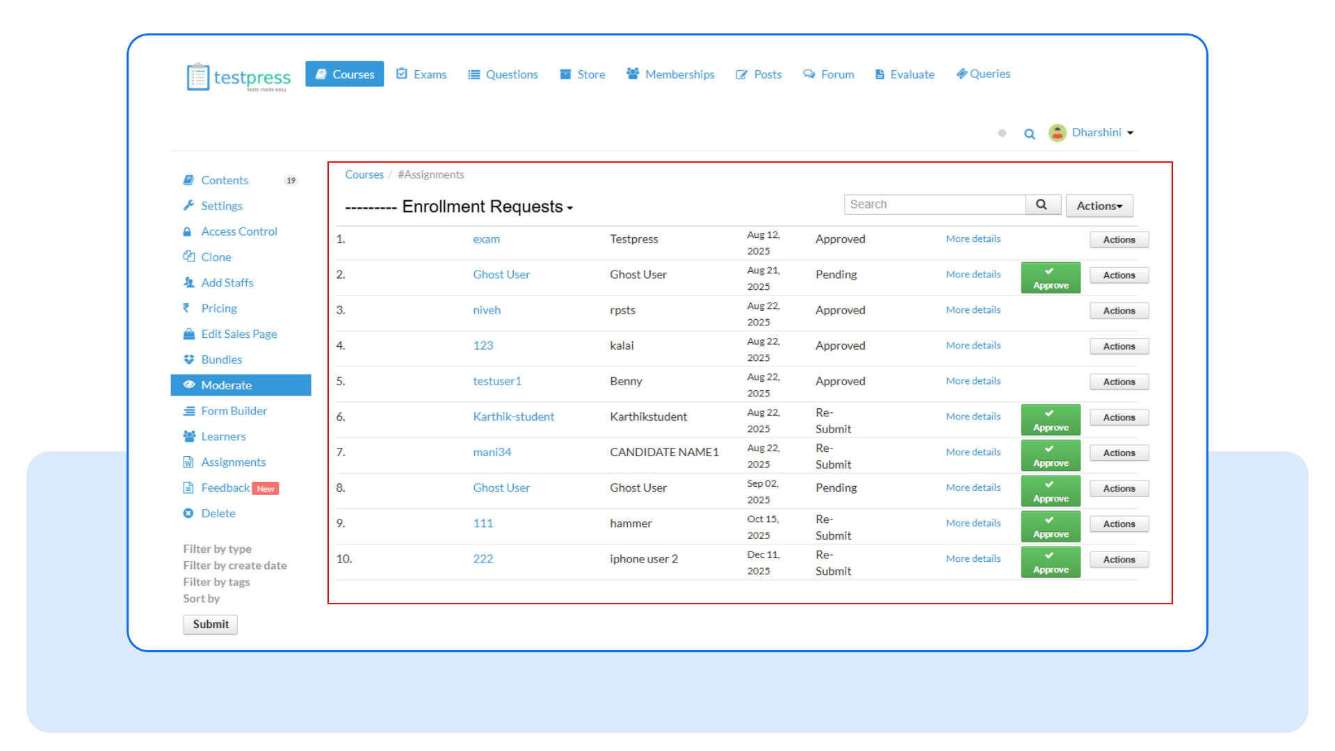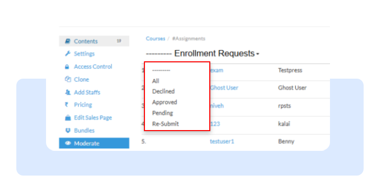Go to Moderate under courses to view all pending enrollment requests for the course.