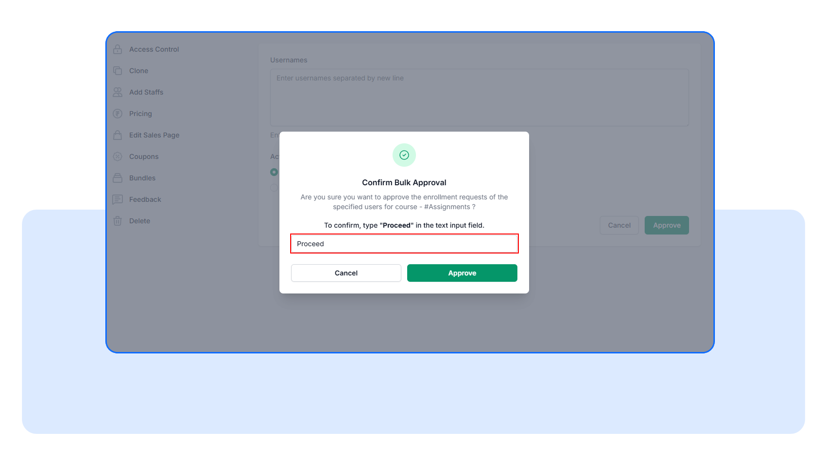 Type Proceed to confirm and complete the bulk approval.
